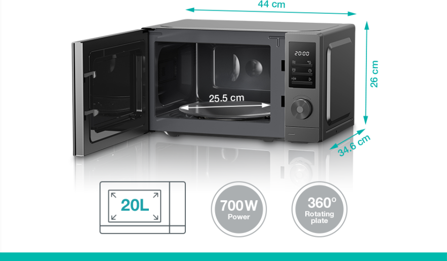 Ova mikrovalna pećnica dolazi sa praktičnim otvaranjem vrata na dugme koje olakšava upotrebu i donosi dodatnu dozu elegancije. Jednim pritiskom dobijate brz i siguran pristup unutrašnjosti uređaja.
